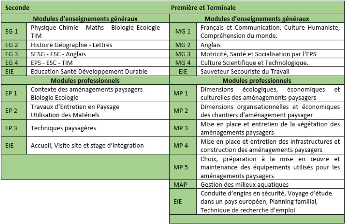 Le Bac Pro est un diplôme de niveau 4 qui permet de travailler en entreprise du Paysage, ou aux services espaces verts d'une collectivité. Il offre la possibilité de poursuite d'étude en CS Constructions Paysagères ou en BTSA Aménagements Paysagers.